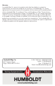 Warranty Humboldt Mfg. Co. warrants its products to be free from defects in material or workmanship. The exclusive remedy for this warranty is Humboldt Mfg. Co., factory replacement of any part or parts of such product, for the warranty of this product please refer to Humboldt Mfg. Co. catalog on Terms and Conditions of Sale. The purchaser is responsible for the transportation charges. Humboldt Mfg. Co.