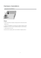 Hardware Installation Hardware Installation Steps: 1. Please shut down the computer, unplug its power cord and remove its chassis cover. 2. Inserting PCI EXPRESS X1 PCI Bus port of Wireless Adapter into PCI EXPRESS X1 slot of PC. Press the Wireless Adapter into the slot firmly. 3. Install chassis cover of PC. 4. Reconnect the computer power cord, and switch computer power on.