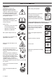 ASSEMBLY • Insert the locking pin (C) in the hole to lock the shaft. • Screw on the trimmer head/plastic blades (H) in the opposite direction to the direction of rotation. Standard harness H Quick release H • At the front is an easily accessible, quick release. Use this if the engine catches fire or in any other emergency situation that requires you to free yourself from the machine and harness. To dismantle, follow the instructions in the reverse order.