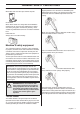 GENERAL SAFETY PRECAUTIONS Quick release There is an easily accessible, quick release fitted at the front as a safety precaution in case the engine catches fire, or in any other situation that requires you to free yourself from the machine and harness. See instructions under the heading Adjusting the harness and clearing saw. Regularly check that the muffler is securely attached to the machine. ! Check that the harness straps are correctly positioned.
