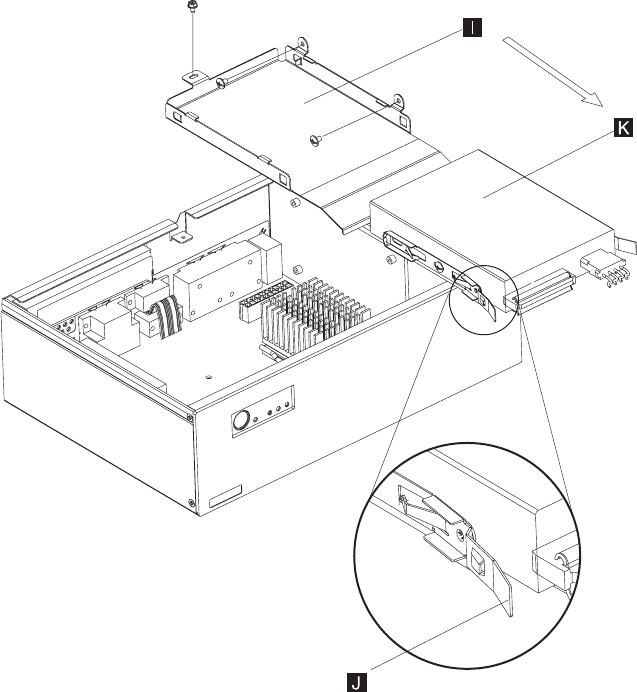 v Press to release the tabs (J) on each side of the hard drive (K) and