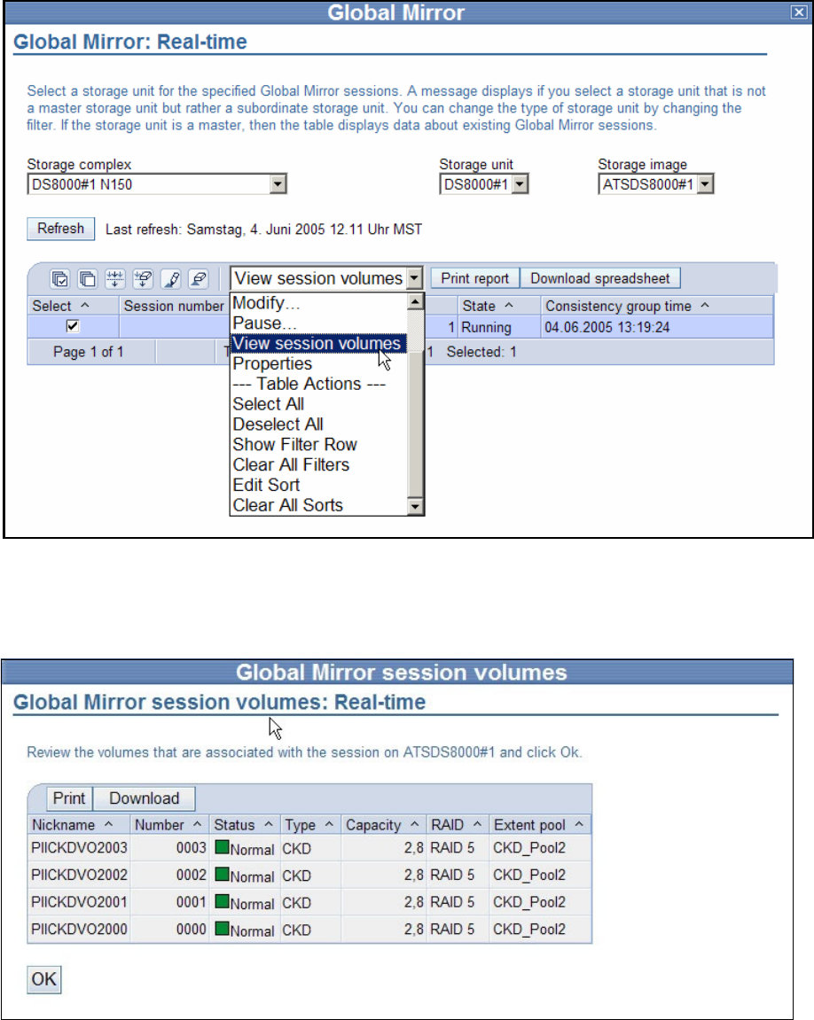 Figure 24-17 View Global Mirror volumes in session1 - select action