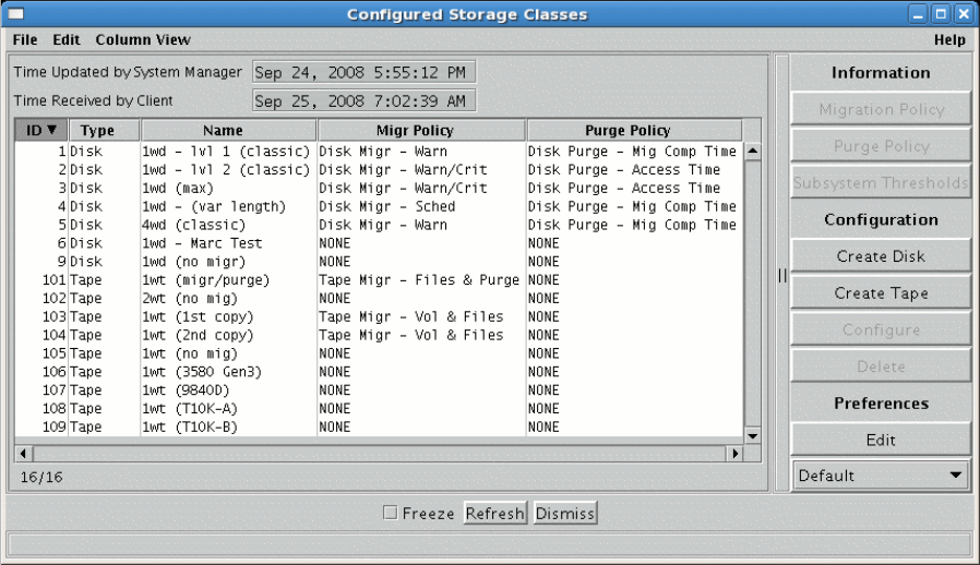 columns display selected fields from the Storage Class Configuration windows discussed in the