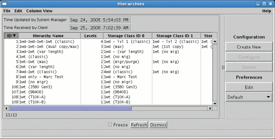 This window allows you to manage storage hierarchies. It lists all currently defined hierarchies and
