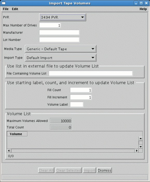 This window allows the user to import tape volumes into the HPSS system, making them known to the