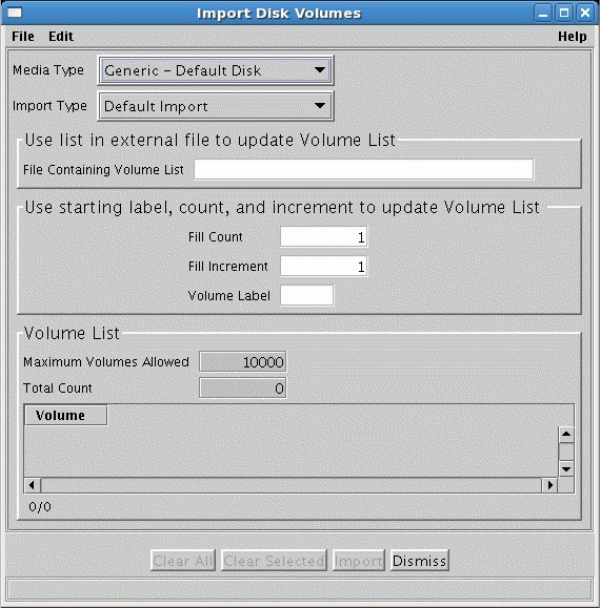 This window allows the user to import disk volumes into the HPSS system, making them known to the