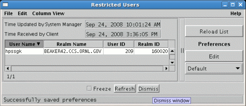 This window lists all the root Core Server users restricted from HPSS access. To open the window, from