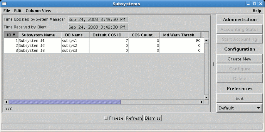 This window lists all the subsystems in the HPSS system and provides the ability to manage these