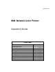 S544-5361-01 IBM Network Color Printer: Operator’s Guide Quick Start Task Requesting service Ordering features and supplies Choosing paper Storing paper Handling transparencies Loading paper Loading transparencies Replacing a toner cartridge Diagnosing problems Clearing paper jams Where to Look page xiii page 1–4 page 2–2 page 2–5 page 2–6 page 3–2 page 3–9 page 5–4 page 6–2 page 6–3