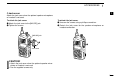ACCESSORIES ■ Supplied accessories NOTE: Some accessories are not supplied with depending on versions. Flexible antenna Battery pack Belt clip Jack cover (with screws) Unit cover (double-sided tape)* 1 ■ Accessory attachments 1 D Flexible antenna Connect the supplied flexible antenna to the antenna connector. CAUTION! • NEVER HOLD the antenna when carrying the transceiver. • Transmitting without an antenna may damage the transceiver. *Use the unit cover as a spare. Ask your dealer for details.