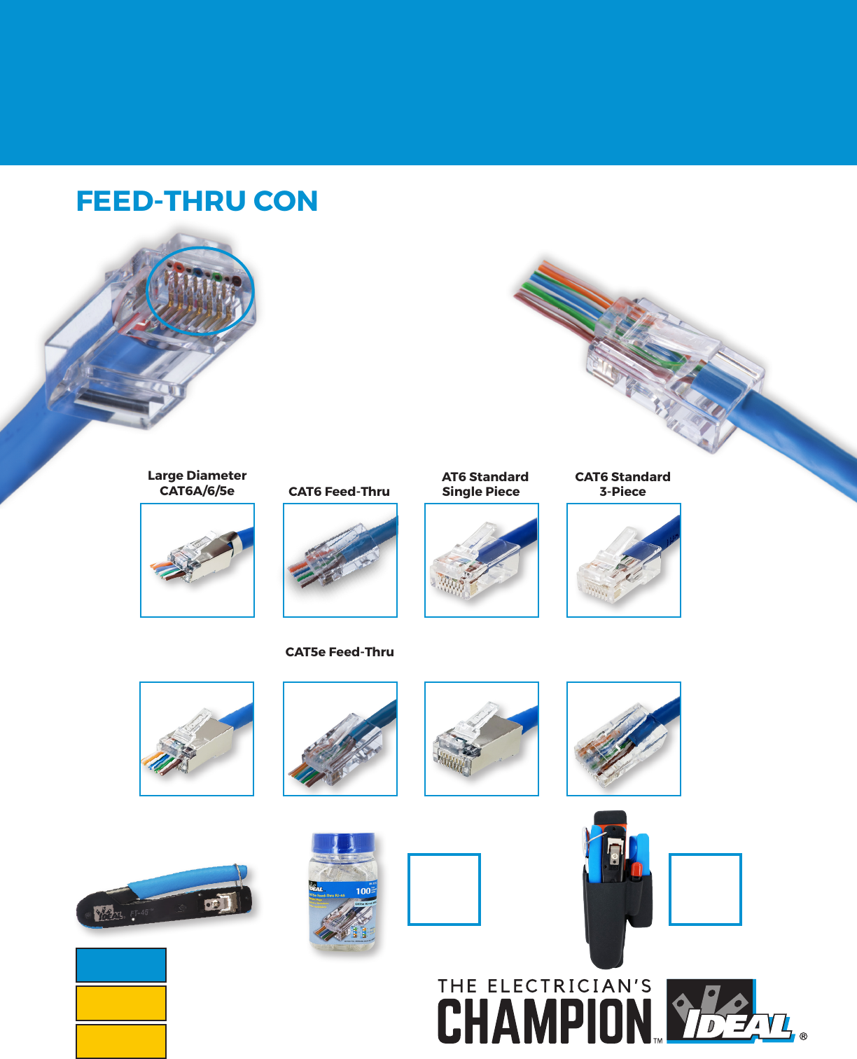 MODULAR PLUG INSTALLATION SOLUTIONS FEED-THRU CONNECTORS VERIFY CONDUCTOR ORDER BEFORE CRIMPING FLUSH CUT NO EXCESS CONDUCTOR Large Diameter CAT6A/6/5e CAT6 Feed-Thru CAT5e Shielded Feed-Thru CAT5e Feed-Thru FT-45™ Crimp Tool Crimps all standard and Feed-Thru RJ-45 Connectors Jar Pack Options CAT6 Standard Single Piece CAT6 Standard 3-Piece CAT5e Standard Shielded CAT5e Standard Kits NEW NEW CAT5e CAT6 CAT6A IDEALIND.