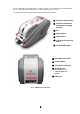can be controlled by two LED buttons. It takes a power via the 24V adaptor provided with the printer. Using USB and Network port, it is communicated with the user’s PC The following shows the outside functional features found on the printer. ④ ① ② ③ ① Top cover open button ② External contactless Smartcard encoding position ③ Fan ⑤ ④ Input hopper ⑤ LED buttons ⑥ ⑥ LCD show the process status ⑦ ⑦ Internal SIM reader Pic.
