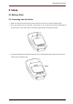 HM-E200 User Manual 2. Setup 2.1 Battery Pack 2.1.1 Inserting into the Printer 1. Make sure that the printer has been turned off before you insert or remove the battery pack. 2. Insert the battery pack into the back of the printer as in the figure shown below, following the direction of the arrow. Press down on the battery pack until the hooks click into place. 3. To remove the battery back, pull back the hook, and use the opposite procedure from the one you used to insert the battery pack.