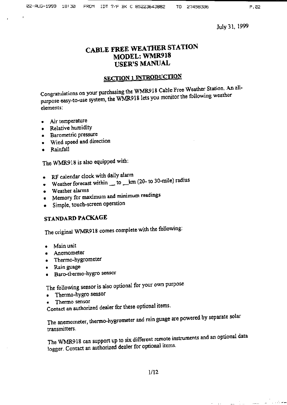 02-A LG-19%% 18:32 FROM IDT P/F BK C 85223643882 70 Assignee July 31, 1599 CABLE FREE WEATHER STATION MODEL: WMR918 USER'S MANUAL ON 1 PRODUCTION Congratulations on your purchasing the WMR918 Cable Free Weather Station, An all purpose easy-to-use system, the WMRO1S lets you monitor the following weather elements: Alr temperature Relative humidity Barometric pressure Wind speed and direction Rainfall + a» en The WMRS18 is also equipped with: RF calendar clock with daily alarm Weather forecast within __ to __