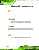 AFOLUX LX Panel PC Manual Conventions WARNING! Warnings appear where overlooked details may cause damage to the equipment or result in personal injury. Warnings should be taken seriously. Warnings are easy to recognize. The word “warning” is written as “WARNING,” both capitalized and bold and is followed by text. The text is the warning message. A warning message is shown below: WARNING: This is an example of a warning message.