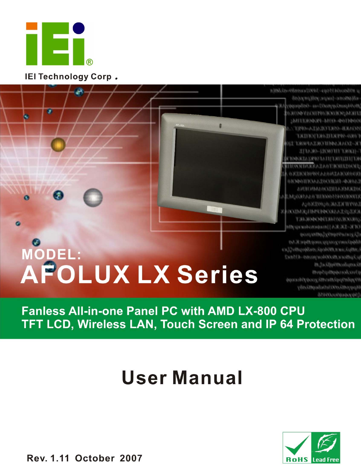 AFOLUX LX Series Flat Panel PC Copyright COPYRIGHT NOTICE The information in this document is subject to change without prior notice in order to improve reliability, design and function and does not represent a commitment on the part of the manufacturer. In no event will the manufacturer be liable for direct, indirect, special, incidental, or consequential damages arising out of the use or inability to use the product or documentation, even if advised of the possibility of such damages.