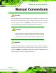 AFOLUX LX Series Flat Panel PC Manual Conventions WARNING! Warnings appear where overlooked details may cause damage to the equipment or result in personal injury. Warnings should be taken seriously. Warnings are easy to recognize. The word “warning” is written as “WARNING,” both capitalized and bold and is followed by text. The text is the warning message. A warning message is shown below: WARNING: This is an example of a warning message.
