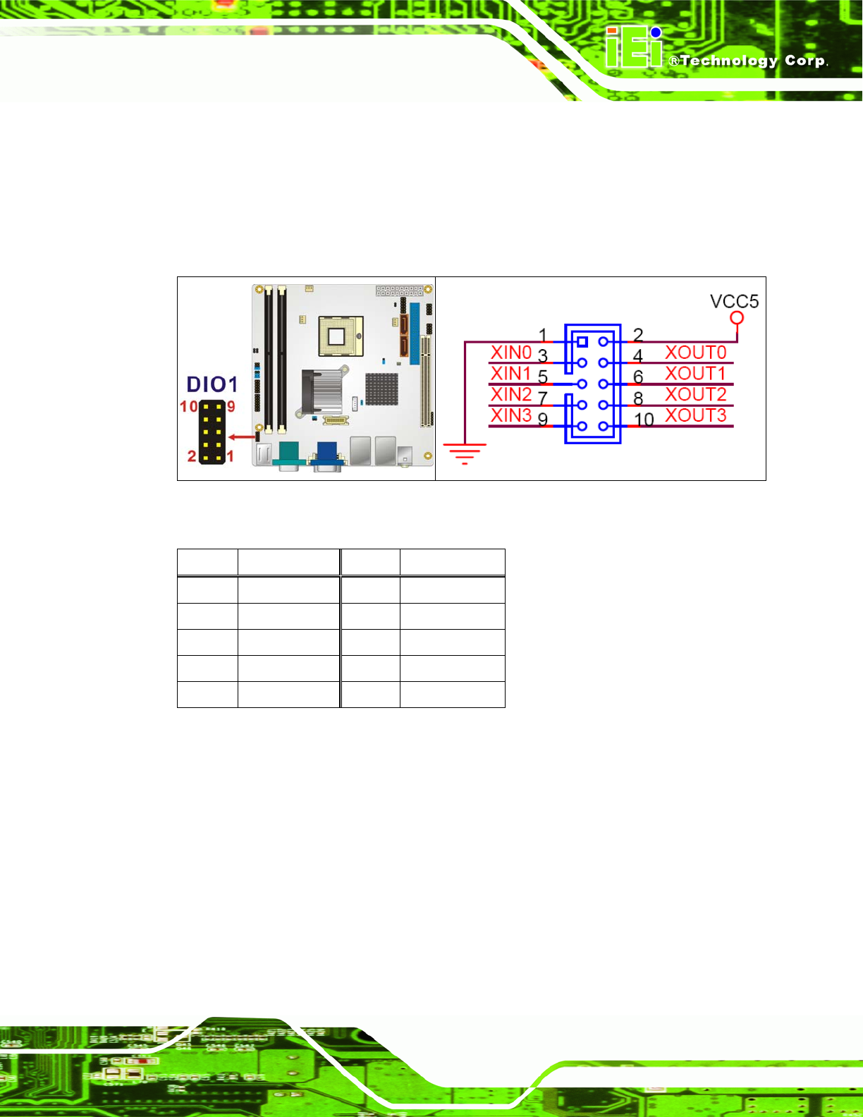 The DIO connector is managed through a Super I/O chip. The DIO connector pins are