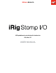 English Maximum Output Level: +13 dBu into 600 Ohms balanced load Frequency Response: from 10 Hz to 21 kHz (+/- 0.2dB) Output Dynamic Range: 102 dB(A) Output Impedance: 150 Ohms balanced Floating Balanced Outputs MIDI Input/Output Connector: 2x 5-pin DIN Warranty Please visit: www.ikmultimedia.com/warranty for the complete warranty policy. Support and more info www.ikmultimedia.com/support www.irigstompio.