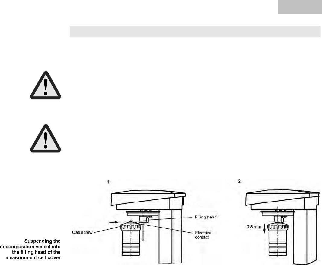 Guide the decomposition vessel carefully until it interlocks with the filling head of the