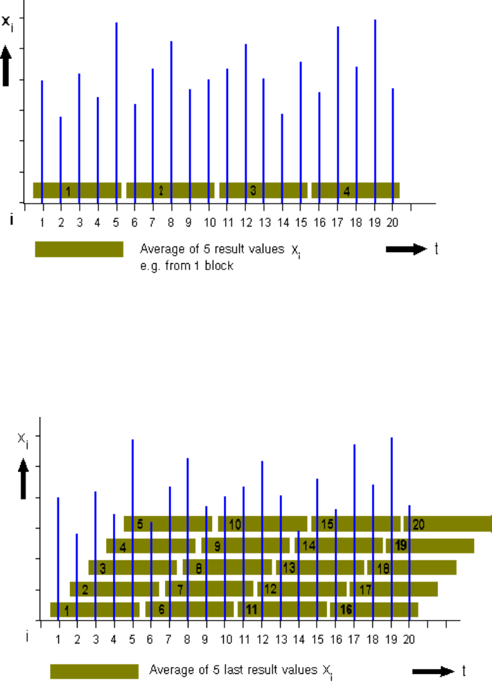 Mean values from n consecutive result values xi are generated, for example, for n = 5 of i = 1 to 5, i =