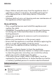 ENGLISH • • • 5 Keep children and pets away from the appliance when it operates or when it cools down. Accessible parts are hot. If the appliance has a child safety device, it should be activated. Children shall not carry out cleaning and user maintenance of the appliance without supervision. General Safety • • • • • • • • • Only a qualified person must install this appliance and replace the cable. WARNING: The appliance and its accessible parts become hot during use.