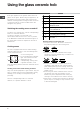 Using the glass ceramic hob GB The glue applied on the gaskets leaves traces of grease on the glass. Before using the appliance, we recommend you remove these with a special nonabrasive cleaning product. During the first few hours of use there may be a smell of rubber which will disappear very quickly. Setting Normal or Fast Plate 0 Off 1 Cooking vegetables, fish 2 Cooking potatoes (using steam) soups, chickpeas, beans.