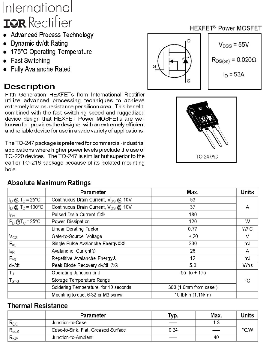 IRFP044NPbF TO-247AC Package Outline Dimensions are shown in millimeters (inches) TO-247AC Part Marking Information EXAMPLE: T HIS IS AN IRFPE30 WITH AS SEMBLY LOT CODE 5657 ASS EMBLED ON WW 35, 2000 IN THE AS SEMBLY LINE "H" Note: "P" in assembly line position indicates "Lead-Free" PART NUMBER INT ERNATIONAL RECTIFIER LOGO IRFPE30 56 AS SEMBLY LOT CODE 035H 57 DATE CODE YEAR 0 = 2000 WEEK 35 LINE H Data and specifications subject to change without notice. IR WORLD HEADQUARTERS: 233 Kansas St.
