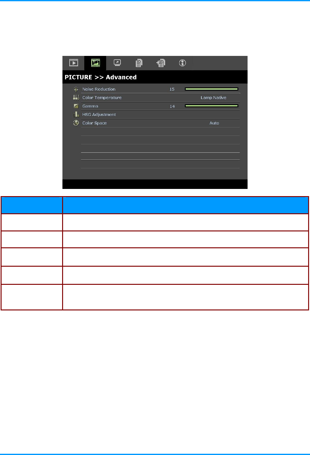 PICTURE>>Advanced menu. Press ◄► to change values for settings.