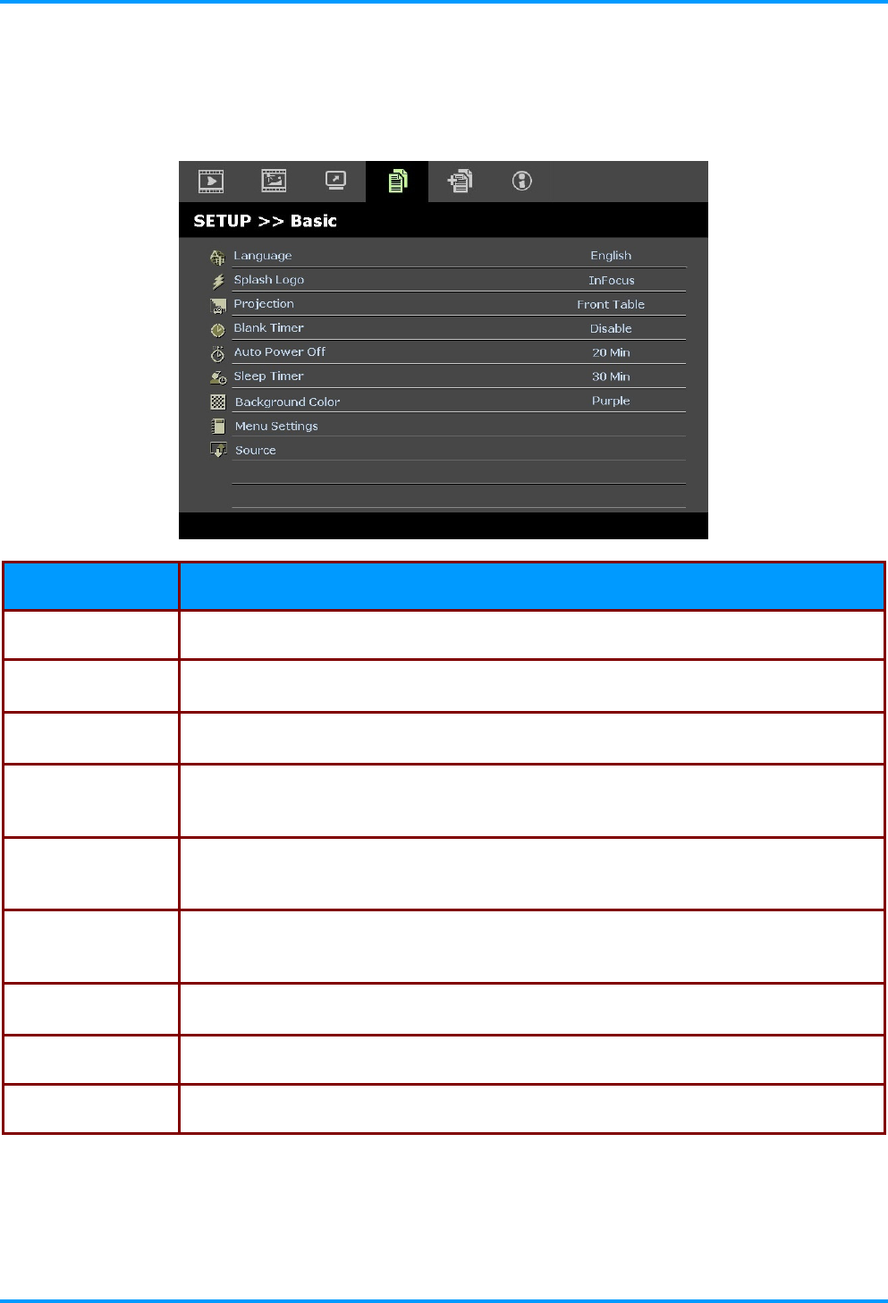 SETUP>>Basic menu. Press ◄► to change values for settings.