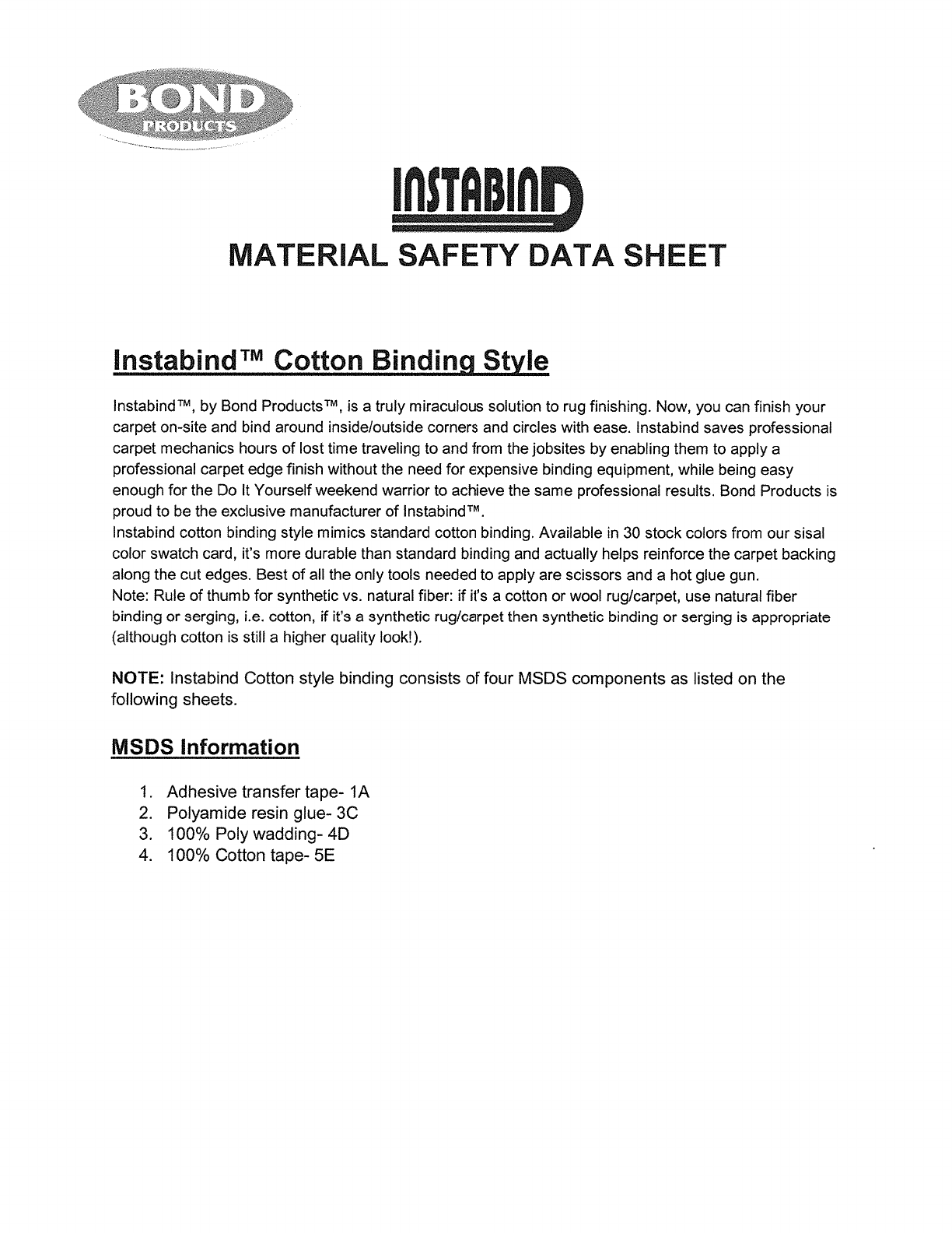 STABBING MATERIAL SAFETY DATA SHEET Instabind™ Cotton Binding Style instabind™, by Bond Products™, is a truly miraculous solution to rug finishing. Now, you can finish your carpet on-site and bind around inside/outside corners and circles with ease.