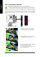 English Step 2: Install Memory Modules Before installing the m emory modules, adhere to the following warning: 1. Please note that the DIMM module can only fit in one direction due to the one notch. Wrong orientation will cause im proper installation. Please change the insert orientation. The motherboard has 2 dual inline memory m odule (DIM M) sockets. The BIOS will automatically detects memory type and size. To install the memory module, just push it vertically into the DIMM socket.