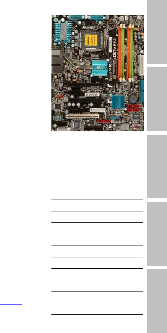 Introduction AW8D Motherboard Intel Pentium 4 Socket 775 Hardware Setup User’s Manual BIOS Setup LGA775 ATX Motherboard SB: Intel ICH7R Chipset 1066MHz FSB Dual DDR2 800 DIMM Slots Dual PCI-E X16 Graphics Slots Driver & Utility CD NB: Intel 975X Chipset Dual GbE LAN IEEE 1394 6x SATA 3Gb/s 7.1 Channel HD Audio Silent OTES™ Technology uGuru™ Technology Appendix About this Manual: This user’s manual contains all the information you may need for setting up this motherboard.