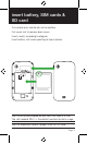 insert battery, SIM cards & SD card Turn phone over and locate slot on bottom. Pull up on slot to remove back cover. Insert card(s) according to diagram. Insert battery with arrow pointing to top of phone. TIP: Data can be enabled on only one SIM card at a time. The slot labelled SIM 1 is the default position for data usage. TIP: For additional media storage, insert an SD card.