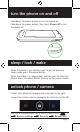 turn the phone on and off Hold down the power button to turn the phone on. Hold down the power button, then touch Power off to turn the phone off. sleep / lock / wake When the power is on, and you want to put the phone in sleep mode, press the power button. When the phone is in sleep mode, and you want to wake the phone, press the power button to bring up the unlock screen. unlock phone / camera Unlock your phone by dragging the circle lock to the right.