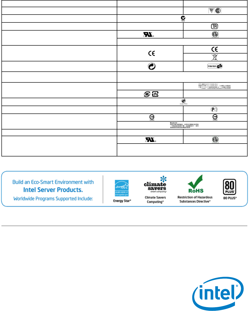 server base boards and host chassis are tested to Class A EMC requirements. Intel server products comply with RoHS (Restriction of Hazardous Substances).