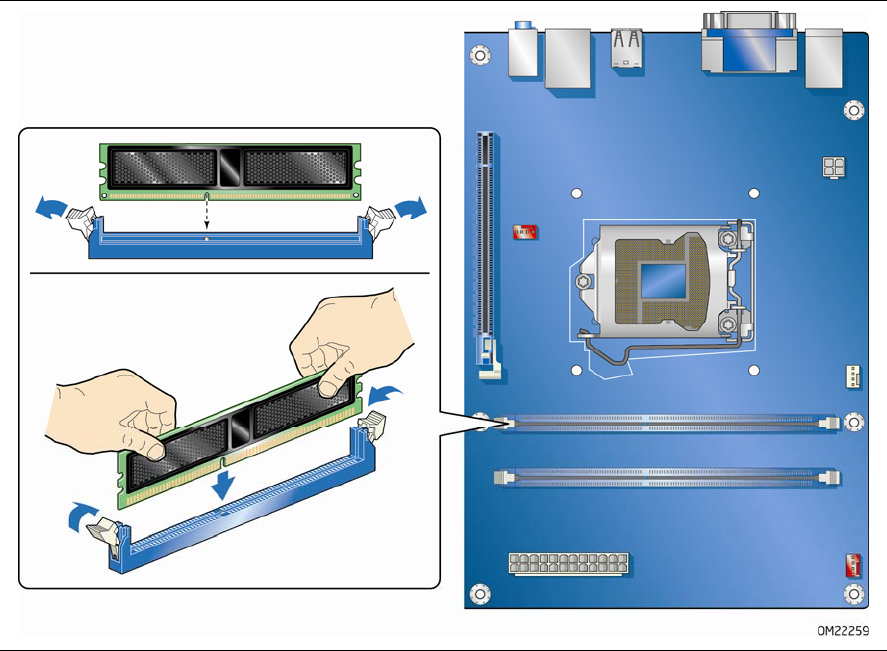 9. 插入 DIMM 期间,按住 DIMM 的顶边向下推压,直到卡固销子将其卡固到位。