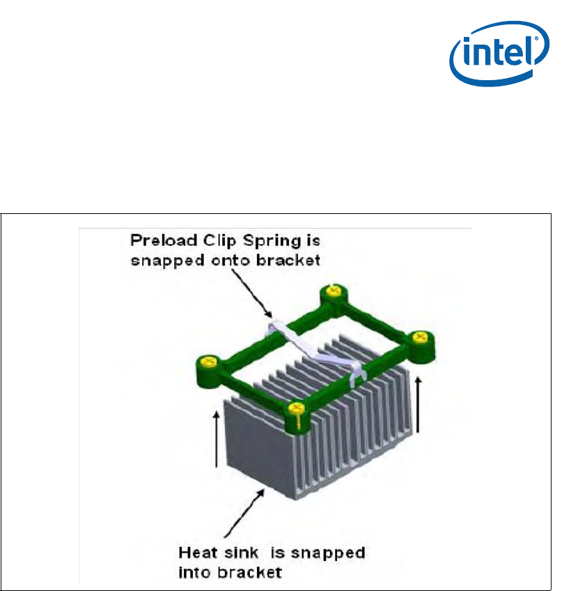1. Snap the preload clip spring onto the bracket. Assemble the bracket with heatsink,