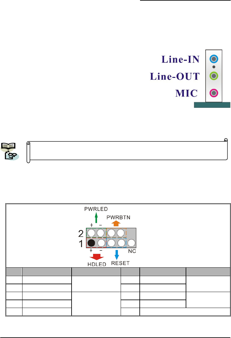 This mainboard provides three audio ports, the Mic, Line-in and Line-out. These are the standard audio
