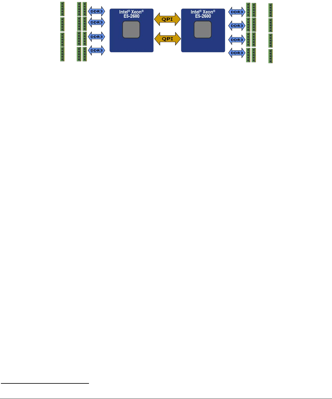 Integrated into the processor is a memory controller. Each processor provides four DDR3 channels that