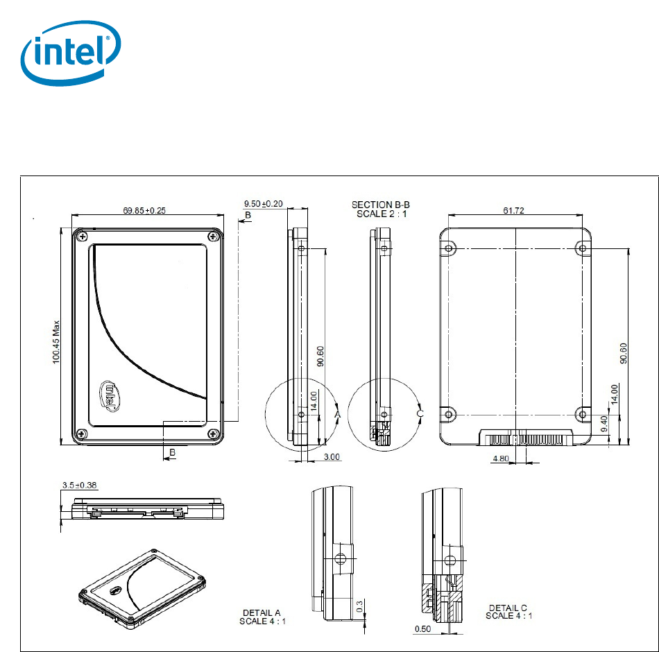 Intel SSD 520 Series. All dimensions are in millimeters.