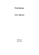CONTENTS 1. INTRODUCTION.................................................................1 1.1 Product Introduction......................................................... 2 1.2 Product Package ............................................................. 3 1.3 Network Printing Architecture .......................................... 4 1.3.1 1.3.2 1.3.3 Print Server Network Functions..................................................... 5 Network Printing Functions for Clients.........................