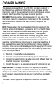 COMPLIANCE This device complies with part 15 of the FCC. Operation is subject to the following two conditions: (1) this device may not cause harmful interference, and (2) this device must accept any interference received, including interference that may cause undesired operation. FCC NOTE: The manufacturer is not responsible for any radio or TV interference caused by unauthorized modifications to this equipment. Such modifications could void the user’s authority to operate the equipment.