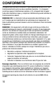 CONFORMITÉ Ce dispositif est conforme à la section 15 des réglementations de la FCC. Son fonctionnement est soumis aux deux conditions suivantes : (1) cet appareil ne doit pas causer d’interférences nuisibles, et (2) cet appareil doit accepter toute autre interférence reçue, y compris les interférences pouvant entraîner un fonctionnement non désiré. REMARQUE FCC : Le fabricant n'est pas responsable des interférences radio ou TV causées par des modifications non autorisées de cet équipement.