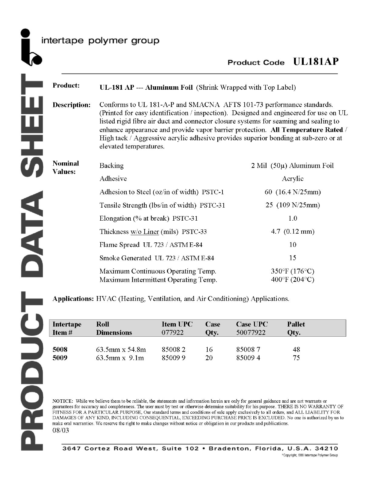 inter tape polymer group PRODUCT DATA SHEET Product Code POPULIST Product: UL-181 AP Aluminum Foil (Shrink Wrapped with Top Label) Description: Conforms to UL 181-A-P and SMACK FATS 101-73 performance standards. (Printed for easy identification / inspection). Designed and engineered for use on UL listed rigid fiber air duct and connector closure systems for seaming and sealing to enhance appearance and provide vapor barrier protection.