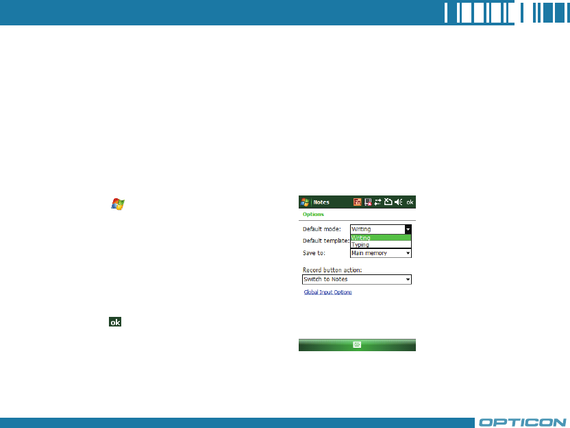 Creating a Stand-alone Voice Recording 1. Tap > Programs > Notes. 2. If the recording toolbar is not shown, tap Menu > View Recording Toolbar. 3. Tap the RECORD button on the recording toolbar and speak into the device’s microphone to record your voice in the notes list. 4. Tap the STOP button on the recording toolbar when finished. Switching between Typing/Writing Modes > Programs > Notes. 1. Tap 2. Create a new note or open an existing note from the notes list. 3.
