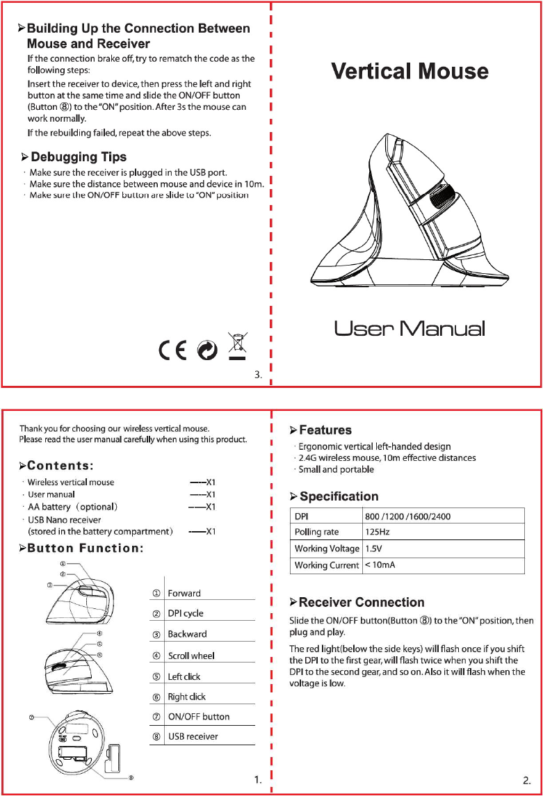 Left Handed Wireless Ergonomic Vertical Mouse for Small Hands with USB Nano Transceiver, AA Battery, 4 DPI, Compatible with Mac and PC, Black