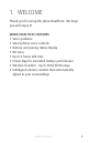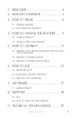 .1 CHANGE EARGELS ENGLISH 1. WELCOME........................................... 4 2. HEADSET OVERVIEW.......................... 5 3. HOW TO WEAR................................... 6 3.2 ATTACHING THE EARHOOK 4. HOW TO CHARGE THE BATTERY........ 9 4.1 CHARGE USING PC 4.2 CHARGE USING CAR CHARGER 5. HOW TO CONNECT............................ 11 5.1 CONNECT TO PC (USING THE JABRA LINK 360 BLUETOOTH ADAPTER) 5.2 CONNECT TO MOBILE DEVICE 5.3 CONNECT TO MOBILE DEVICE (NFC) 6. HOW TO USE ....................