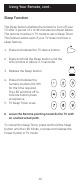 Using Your Remote, cont. Sleep Function The Sleep button enables the remote to turn off your TV after a period of 1 to 99 minutes as shown below. The remote must be in TV mode to set a Sleep Timer. This feature works even if your TV does not have a sleep feature. 1. Press and release the TV device button. 2. Press and hold the Sleep button until the LED remains lit (about 2-3 seconds). 3. Release the Sleep button. 4. Press and release the numeric buttons (01-99) for the time required.