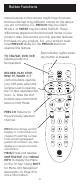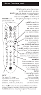 Button Functions, cont. SETUP Used to setup the remote, and for code search function. SHIFT Press and release to access buttons labeled in reverse print (OK, MENU, EXIT). See “Using SHIFT for Menu and Navigation” description on Page 9 ON•OFF Turns product On or Off. MUTE Turns off the TV sound while the picture remains. OK Selects menu items for the device you are controlling. VOLUME UP/DOWN Changes the volume level of the product, normally the TV. CHANNEL Up/Down Changes the channels.